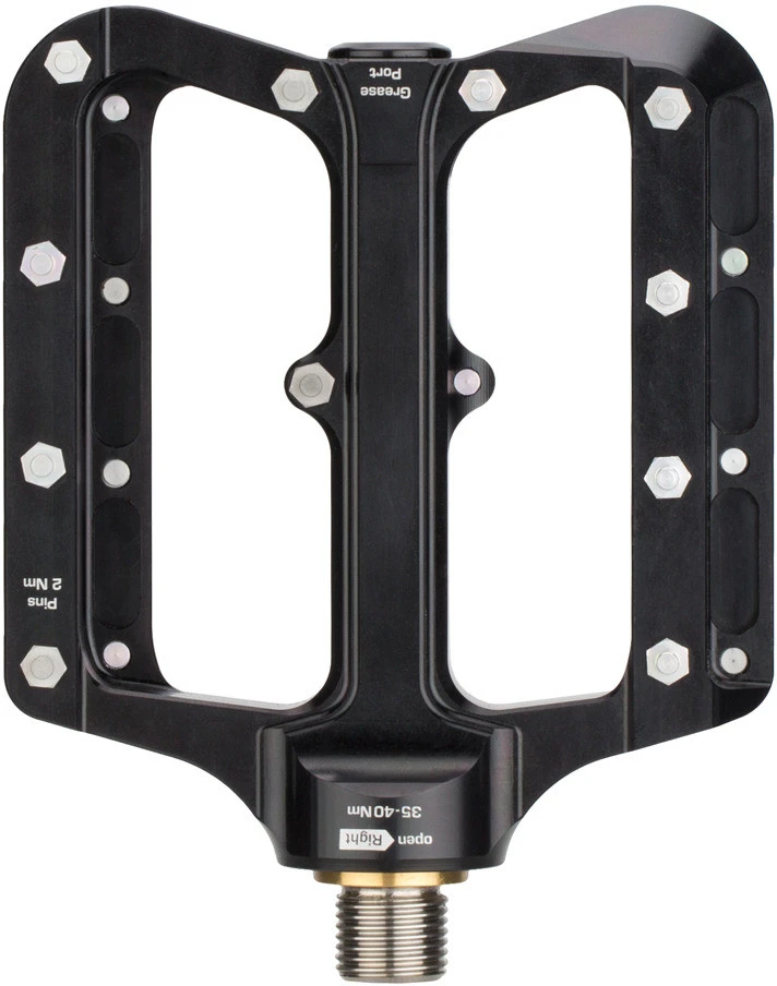 Spezifikationen:Einsatzbereich:All Mountain, TrailAusführung:PlattformpedaleTechnische Daten:Material Pedalkörper:Aluminium (7075-T6)Material Achse:TitanLagerung:3 OS-PräzisionskugellagerDichtungen:doppelte PU-LippendichtungenBauhöhe:16 mm (ohne Pinhöhe)Maße (Länge x Breite):93 mm x 87 mm (small), 100 mm x 92 mm (medium), 105 x 100 mm (large)*Anzahl Pins:22Pinhöhe:4,2 mm (davon 2,8 mm gewindeloser Stift, 1,4 mm Sechskant-Flachkragen)